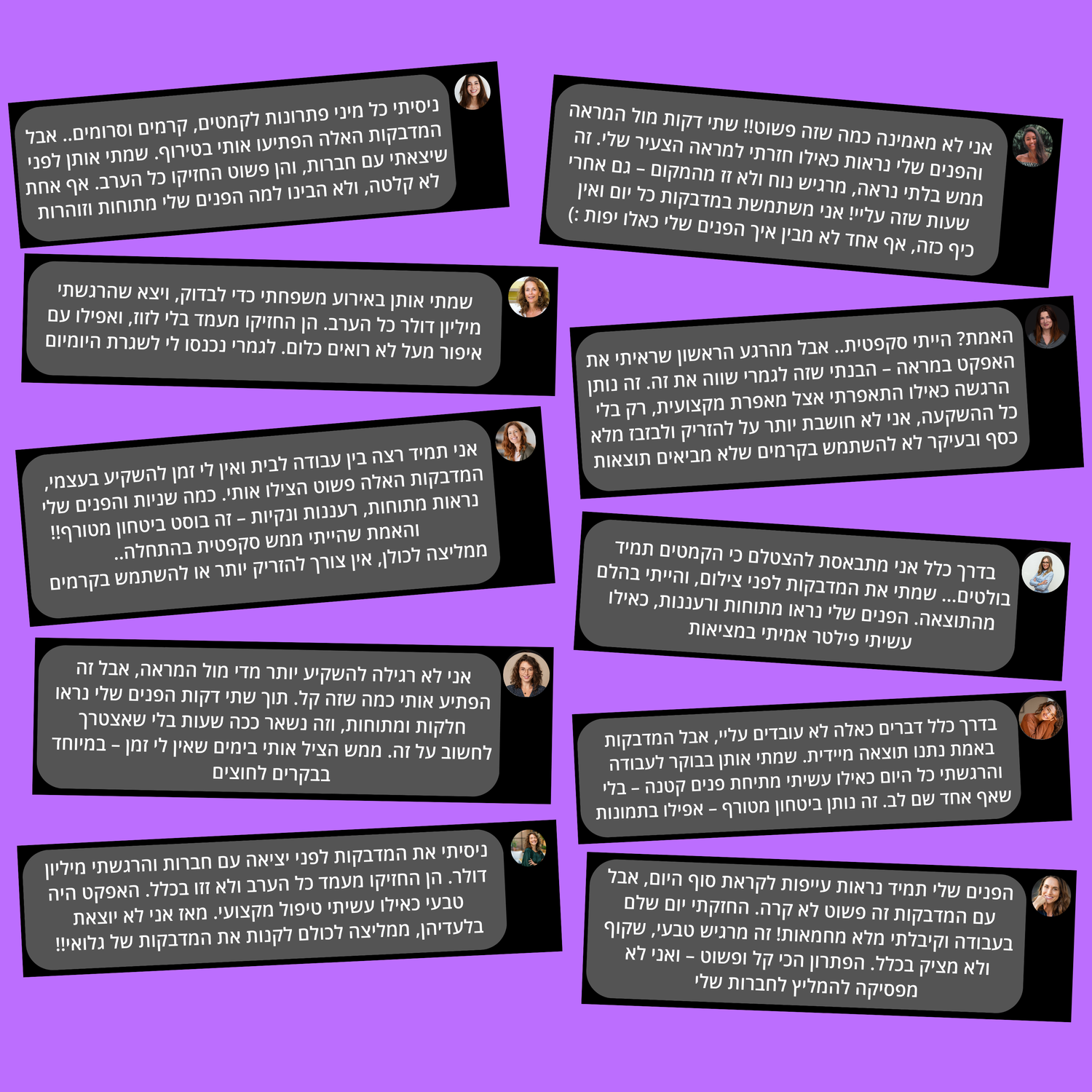 מספרות שהמדבקות העניקו להן מראה מתוח ורענן באופן מיידי, ושכבר אחרי שימוש קצר שמו לב שהקמטים בפנים נראים פחות בולטים והעור נראה חלק יותר.